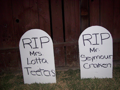 Lastly is the display my bro in law did. Every year his son Ikie has a party with a few friends and G (when you see G, that means my brother in law), so G grills them up some burgers and dogs and does some decorations and gets them scary movies to watch. Well this year he really out-did himself. He made headstones and he and my sister had a good time thinking up the names on them. They're pretty self explanatory, so just enjoy the pictures!