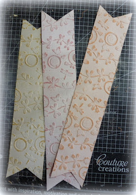 My second layout for Couture Creations uses many of their die cuts and showcases how you can use the embossing folders to make continuous strips for longer border pieces or accents like mine.